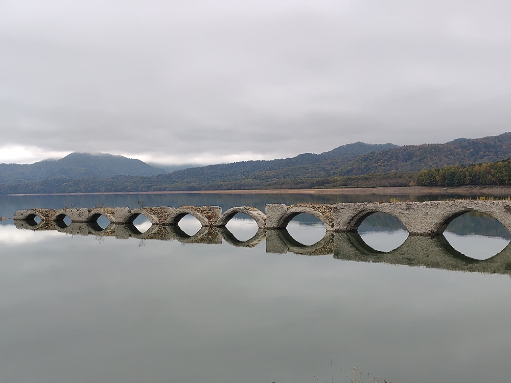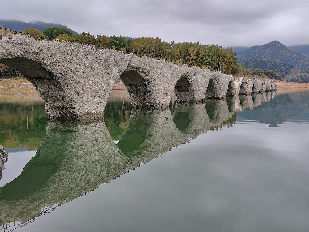 着いた時は、タウシュベツ橋の東側(湾内)が”油を流したような”という表現そのままの水面で、きれいに橋が反射していました。
