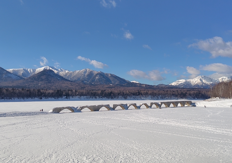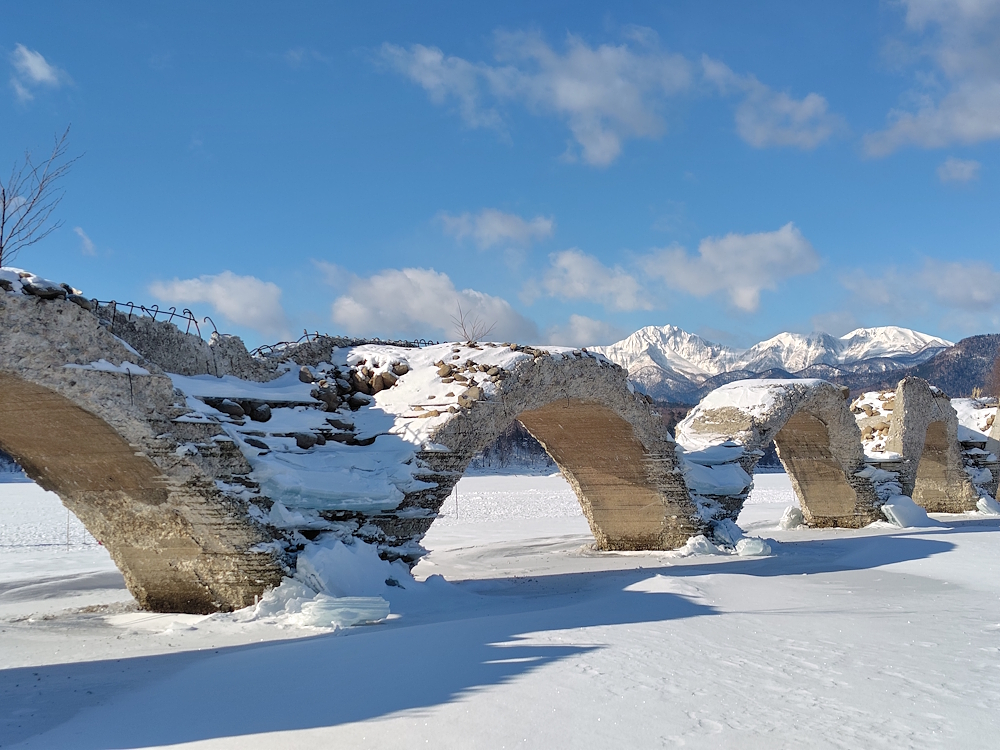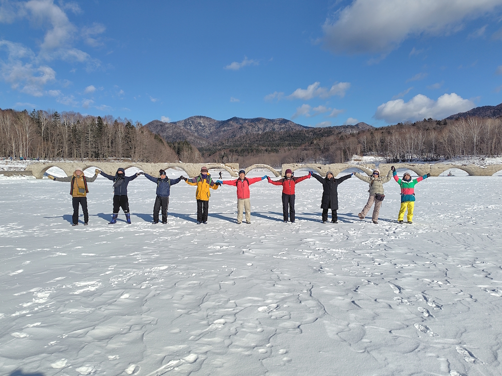 湖上に風もなく、積雪も氷の上にうっすらあるぐらいという、最上のコンディション。皆さんと気楽にタウシュベツまで歩いてゆくことが出来ました。
