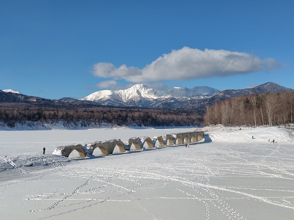 橋は半分ぐらい出てるし、ニペソツ山も見えるし、風がないから暖かい