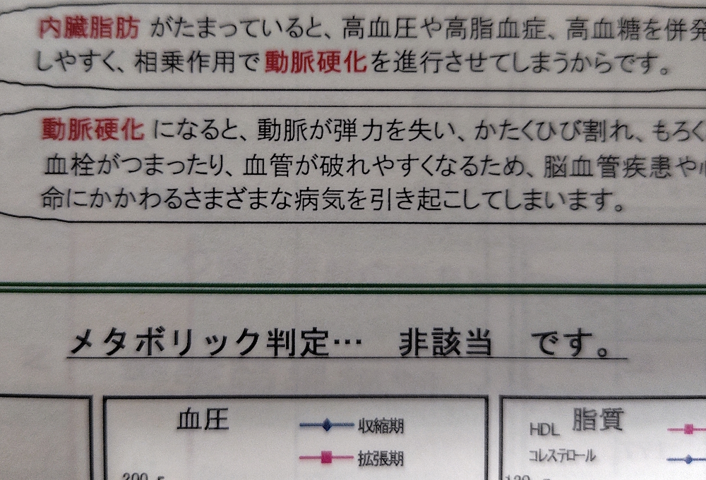 昨年12月10日の当ブログ記事にて、「オレはメタボになった」との表記がございましたが、本日正式な診断結果が届きメタボではないとの診断がくだされました。
