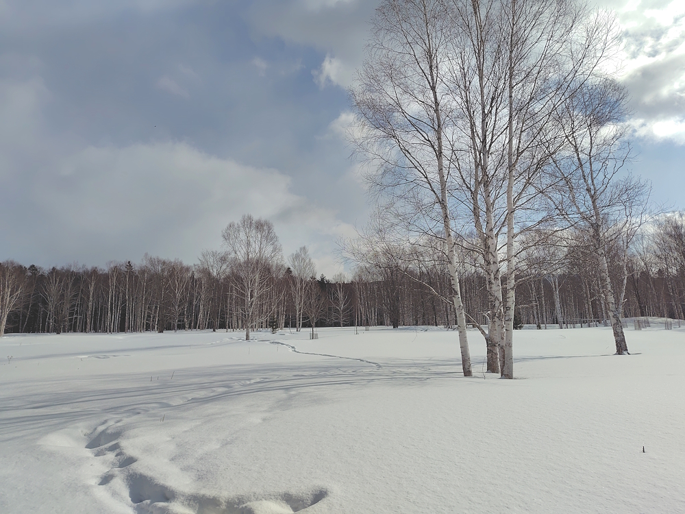 場所によっては腰まで埋まるようなふかふかの雪原を、汗をかきつつかつての小中学校跡地までスノーシューで上がってみました。